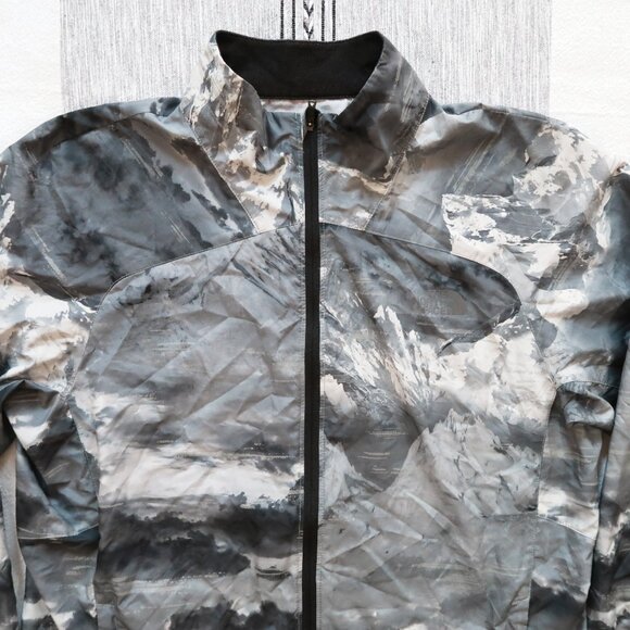 The North Face Ambition running jacket in a men's medium. Made from a lightweight FlashDry material, this features a gray and white mountain print throughout, and has two zippered hand pockets. Perfect for running, nordic skiing, or hiking. Lightly used, and in excellent preowned condition.
