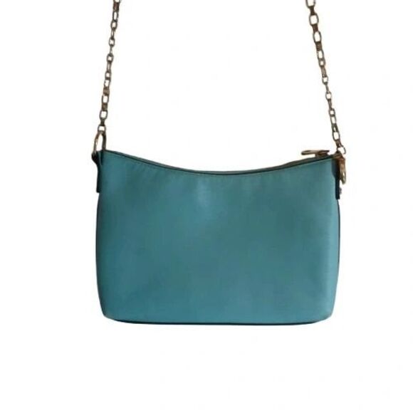 This is a gently used Merona crossbody bag that brings a pop of turquoise to any outfit. Bag has no stains, scratches, or odors. It does have a few scuffs on the paint on the bags bottom. See the picture before purchasing. The gold chain strap hardware shines like new and really goes well with the faux leather bag, making it stand out well while being carried. The bag dimensions are 10" W x 7" H x 2" W with a 22" inches strap. Also features an interior zip pocket for keys or cards, slip pocket for phone or receipts. This nice pre-owned bag is the perfect hands-free companion for errands or brunch. It will hold the essentials without weighing you down, ready for its next adventure with you!