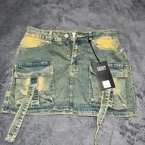 Acid Wash Denim Mini Cargo Skirt