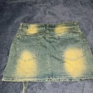 Trendy denim mini skirt with bold yellow accents. Features front pockets and stylish belt details. Ideal for casual wear.