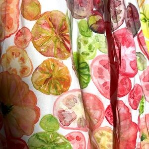 Brand new! Swirl into summery days in this spinnable skirt that's patterned with hand-painted slices of heirloom tomatoes. Side pockets. Hidden zipper closure on side. Elasticized waistband on back.