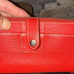 Bold scarlet leather wallet by Dooney & Bourke. Secure zip-around design.