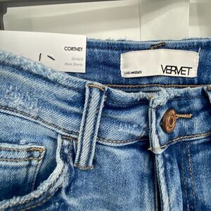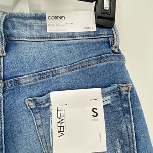 Vervet Jeans Cortney Stretch Mom Denim Shorts for Women Distressed in Medium Wash These Vervet Jeans Cortney Stretch Mom Shorts for Women in Denim are not only adorable, but offer a great stretchy fit. The high-rise, mom fit, light wash denim shorts have a distressed hem.