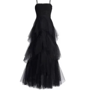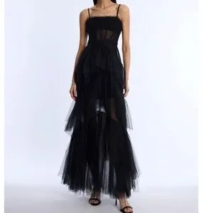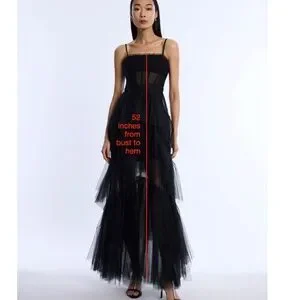 Black Tiered Ruffle Tulle Evening Gown from BCGB MAXAZRIA -- perfect for black tie weddings and formal events. Super trendy, I've seen this on a handful of girls this wedding season. Only worn once and dry cleaned, like new condition. **I had this dress hemmed. It is ~52 inches long from the top of the corset/bust to the bottom of the dress/hem.