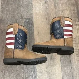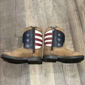 These stylish kids cowboy boots feature a patriotic design with stars and stripes. Worn a hand full of times. Like new!