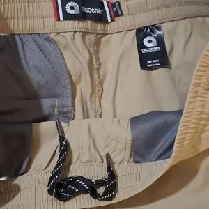Khaki shorts by Akademiks. Perfect for everyday wear. Comfortable fit. Features 2 zipper pockets and a drawstring.