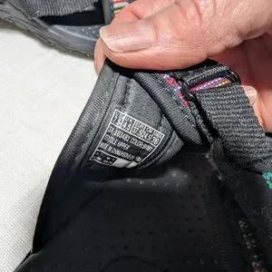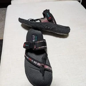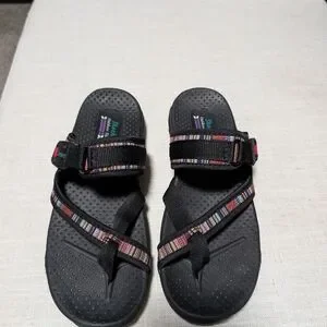 Stylish black sandals featuring multicolor straps. Perfect for casual wear. Gently used. Very comfortable