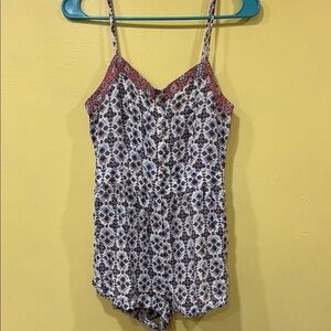 Stylish romper with a blue and red pattern. Features button details and adjustable straps.