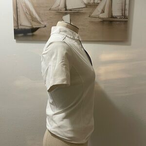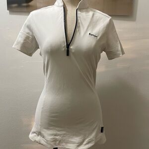 Chic Barbour top with a blue zip-up collar. Short sleeves for a casual look. Ideal for versatile styling.