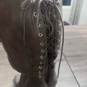 Step out in style with these elegant gray faux suede knee-high boots. Perfect for any occasion, these boots offer both comfort and sophistication. Full zip up at inner ankle with cute tie detail making these beautifully unique.