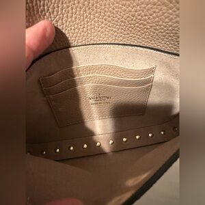 Authentic Valentino Garavani Rockstud pouch in grainy calfskin leather. Poudre color way, which is a beautiful taupe/tan.