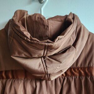 Hooded, hood, Maje, topper, brown, caramel, cognac, chestnut, amber, rust, Parisian chic, autumn, fall, cool, crisp, transitional, outerwear, outdoors, walking, nature, contemporary, lightweight, versatile, comfortable, chic, cozy, warm, snug, soft, city, countryside, cabincore, weekend, daily, casual, work, school, outings, everyday, effortless, timeless, wardrobe staple, Paris, French, layer, layering, streetwear, casual chic, cropped jacket, puffer, tone-on-tone, EUC, ribbons
