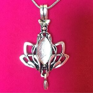 The Lotus Flower Pendant Necklace is a beautiful accessory featuring a 43mm long lotus flower pendant on a silver tone chain with a lobster closure. The pendant is made of zinc alloy and showcases a white/colorless faux stone. This necklace is perfect for occasions such as Christmas, graduation, and birthdays, and has a style that embodies beauty and nature. This pendant necklace chain is 16” in length, and is sure to add a touch of elegance to any outfit. NWOT