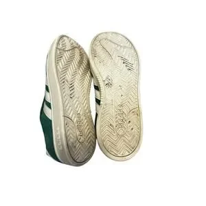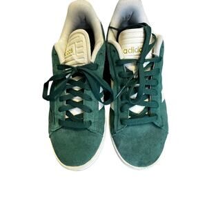 Classic Adidas VL Court 2.0 low-top sneakers in forest green suede with white stripes and off-white soles. Men’s 8.5 US / Women’s 9.5 US (UK 7, EU 40⅔, JP 255)(UK 7 / EU 40⅔ / JP 255). Gently pre-owned, light wear on soles, uppers in very good shape. Comfortable cushioned footbed, durable rubber sole.