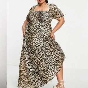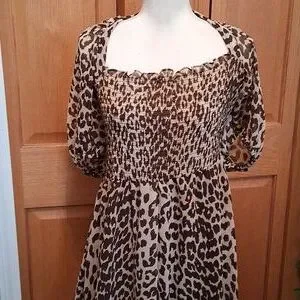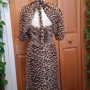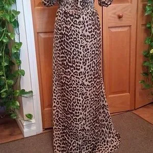 Embrace your wild side with this stunning leopard print maxi dress. Perfect for any occasion, this dress combines style and comfort effortlessly. This dress has a fully lined skirt, an elastic top for a lovely fit, almost elbow length sleeves, and an open back that ties. The actual dress is the same as the model pictures. Please see all the pictures for the details and measurements. 209/25/25SHOBI