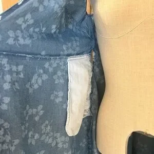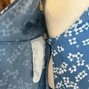 The fabric is a soft, breathable denim in a medium blue tone, adorned with an allover white hibiscus floral print that adds a fresh, feminine touch.