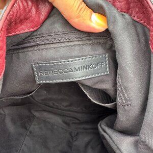 Chic and roomy Rebecca Minkoff hobo bag in a rich burgundy/wine pebbled leather. Features a slouchy silhouette, single shoulder strap with silver-tone hardware, and a spacious black fabric interior with zip and slip pockets for organization.