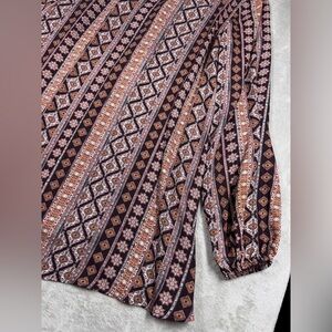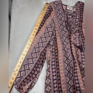 Tunic or mini dress depending on height, lace up neckline with boho fringe tassels, long puff sleeves with elastic cuffs, floral striped print in purple, pink, white, and orange. Unlined.