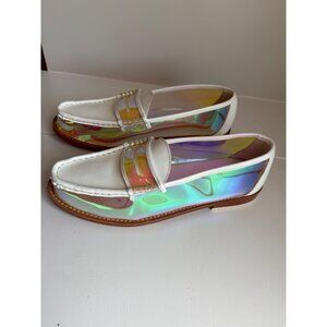 These Loafers are in a white leather front with a see through iridescent side. Stylish and comfortable slip-on flat designed for women. Made by G.H. Bass & Co.is a classic slip-on closure and relaxed loafer style make it easy to wear for everyday casual wear.