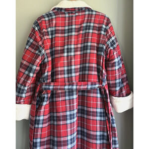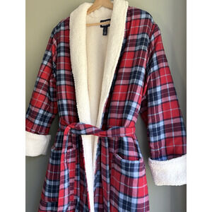 LANDS END Size Large 14-16 Red Plaid Cotton Flannel Sherpa Lined Bath Robe Cozy