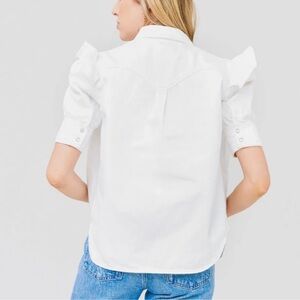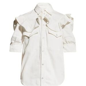 Stylish white button-up shirt with ruffled shoulders. Perfect for a chic look.