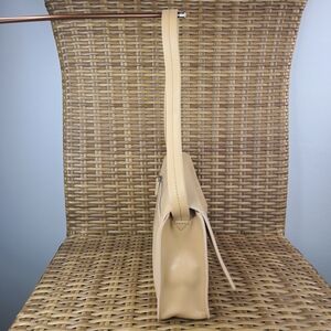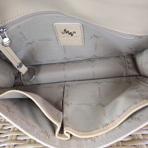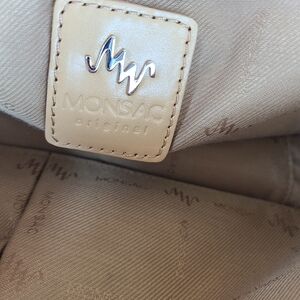 Monsac Original handbag, purse, or shoulder bag. Cream in color. Excellent quality genuine leather. Main pocket has fold-over flap with magnetic snap closure with one inner zip pocket, two slip pockets, and key ring holder. There are some small discolorations in certain areas on the exterior leather. Please see all the photos.