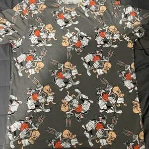 Space jam All over print. Made of breathable cotton material and available in size XL, this short sleeve shirt is perfect for the warmer seasons of summer, fall, and spring. The gray color and regular fit make it versatile for casual wear