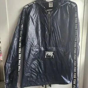 Navy windbreaker with bold PINK logo on sleeves. Lightweight and stylish. Ideal for casual wear.