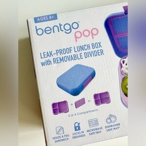 Bentgo Pop lunch box in vibrant purple and blue. Features a removable divider for easy organization. Brand new.