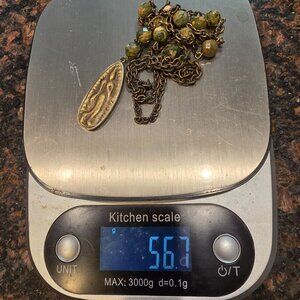 Light wear on chain and pendant, with slight patina on metal. Top to bottom of pendant = 2 inches.