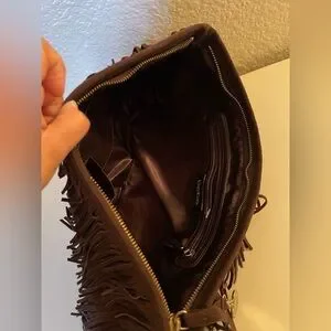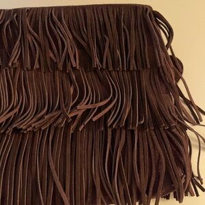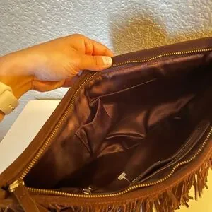 bebe Dark Brown Fringe Clutch with Heart Tags