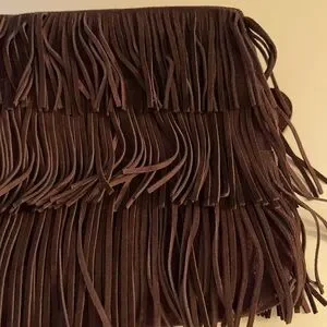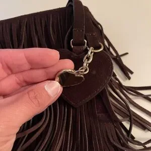 Chic dark brown clutch with playful fringe. Features a heart charm accent. Ideal for adding style to any outfit.