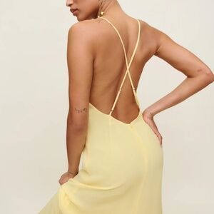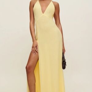 Shop the Zani Dress from Reformation, a sleeveless maxi dress with a deep v-neckline, side slit, and open back.