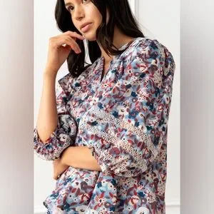 This elegant blouse from Mi Golondrina features a relaxed, boxy fit with a sophisticated mandarin collar. Crafted in a soft cream hue, it offers 3/4 sleeves for a versatile and stylish look. Perfect for adding a touch of elegance to any outfit.