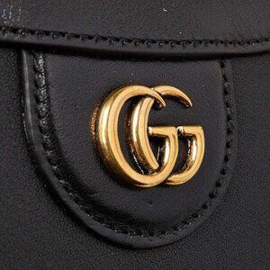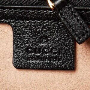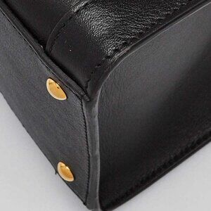 The exterior leather is clean with indentations to the leather on the front. The handles are clean and the shoulder strap remains clean with some creasing from the buckle. The handles have left indentations on the leather along the opening. The interior lining is clean with no wear.