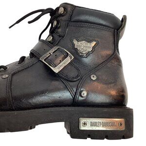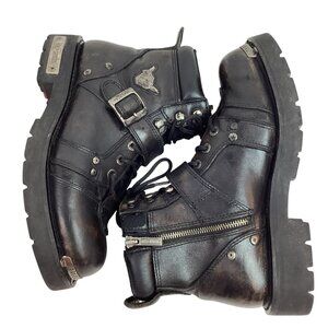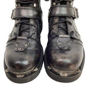 motorcycle boots, Harley Davidson, leather boots, men's footwear, black boots, riding boots, biker boots, lace-up boots, USA size 9.5, durable sole, zip closure, buckle strap