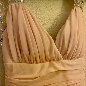 This elegant blush evening gown features a flattering V-neck and delicate pleats, perfect for any special occasion. Homecoming! Small stitch at the bust.