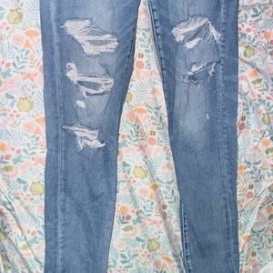 Trendy light blue cropped jeans with a distressed design. Perfect for casual wear.