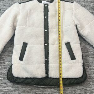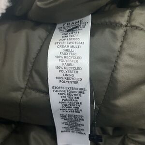 Frame's army jacket features a cozy sherpa exterior. This oversized style is finished with a round neck, silvertone snap buttons, and contrasting welt pockets.