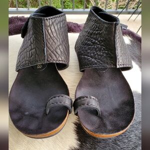 Stylish black sandals with a unique textured design. Features a comfortable toe loop and ankle strap.