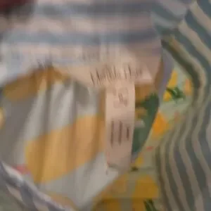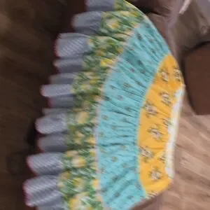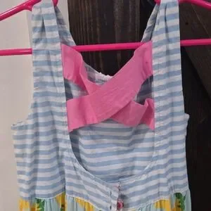 This vibrant kids dress features a delightful mix of blue stripes and floral patterns in yellow and green. Perfect for any occasion, it combines comfort with style.