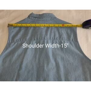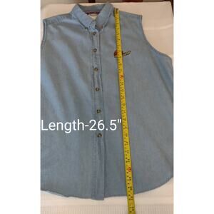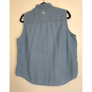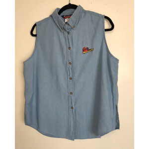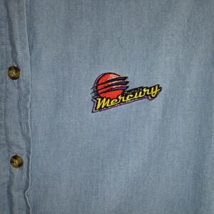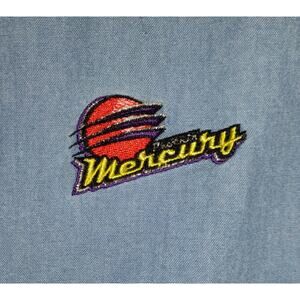 Previously Owned Vintage Champion Phoenix Mercury WNBA Sleeveless Denim button up shirt. Has the Mercury Logo on front, button down collar. Light blue Denim. Bottom side slits.