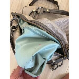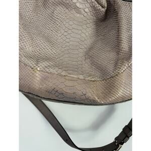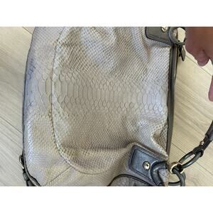 Elevate your style with this Coach snakeskin embossed purse! The gray and sage tones create a sophisticated, neutral palette that complements any outfit.