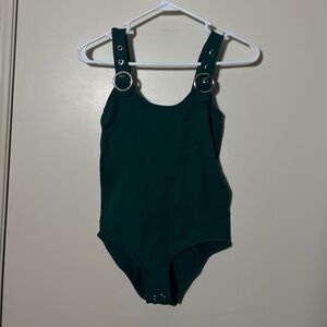 Stylish teal one-piece swimsuit featuring ring accents on the straps. Perfect for a chic beach look.