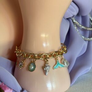 Chic gold bracelet featuring sea life charms. Includes starfish, shell, and whale tail designs.