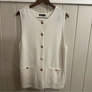 Stylish white knit vest with a button-up front. Sleeveless design for versatile layering.