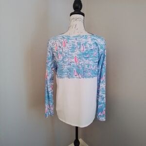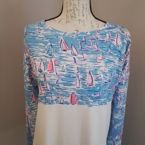 Hit the water in this long sleeve tee Finn Top from Lilly Pulitzer. The tee is in the color and print of Zanzibar Blue Boatylicious. Size S; 47% modal, 46% Pima Cotton, and 7% Spandex. Excellent condition.