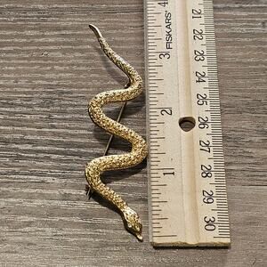 Unique gold snake brooch. Slithering wiggly body with rhinestone eyes and protruding tongue.