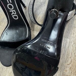 Chic Tom Ford heels in sleek black. Features elegant silver detailing. Ideal for stylish outings.