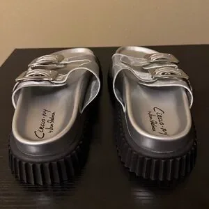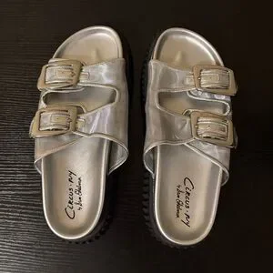 Stylish silver slide sandals with double buckle design. Perfect for casual wear.
